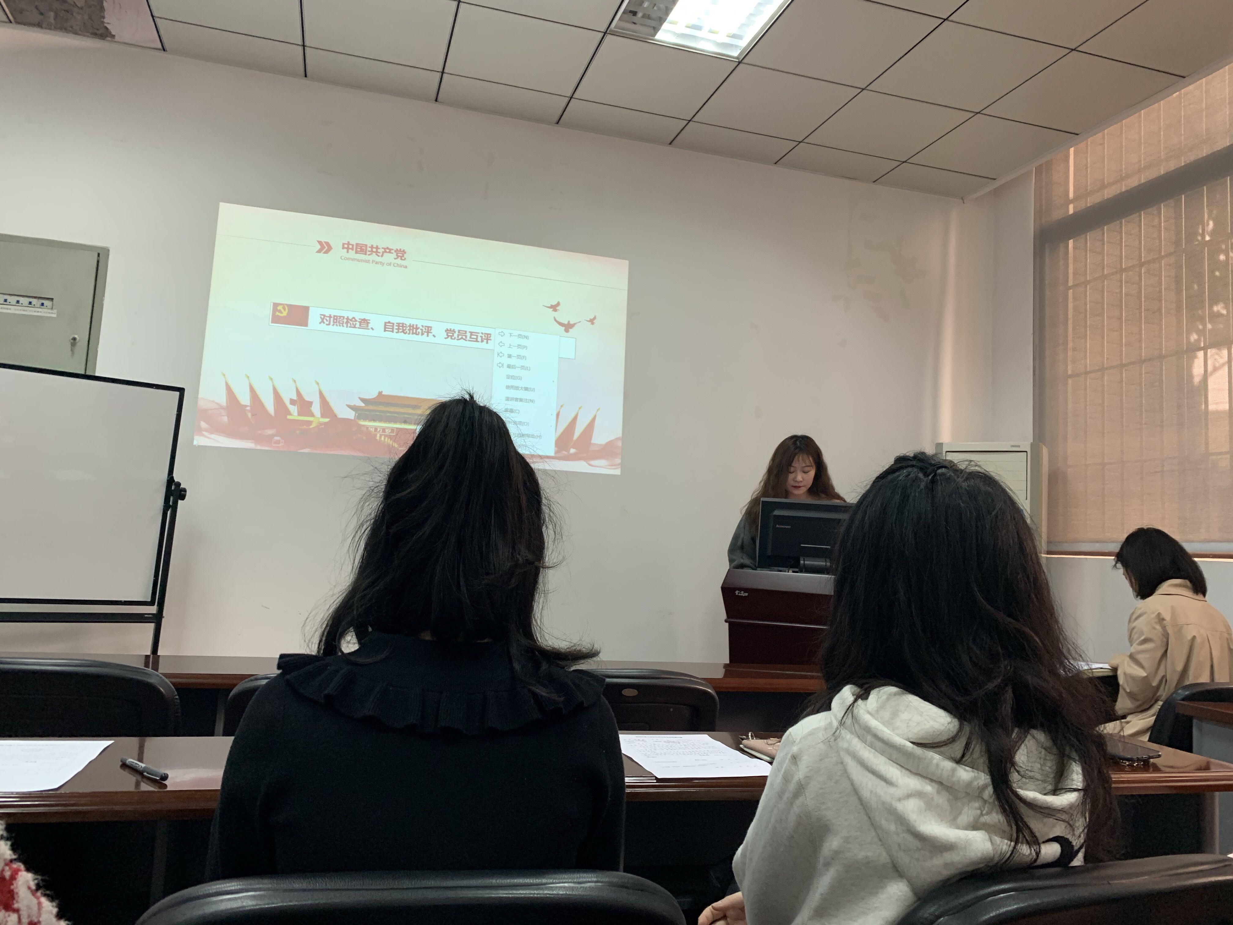 此次组织生活会分为三个环节。第一个环节是党支部书记代表支委会述职。支部书记周子熙同志首先向大家介绍了支部的基本情况。bat365官网登录入口硕士2018级第一党支部由16名正式党员,2名预备党员,1名入党积极分子组成。其中,支部书记周子熙同志、组织委员宋丹同志、宣传委员马艳林同志三人组成了支部委员会。周嘉南老师为联系党委委员。随后,周子熙同志回顾了去年开展的20余次党组织生活会,主要包含讲党课(党支书讲党课、党员同志讲党课等)、学习党内材料(《习近平总书记教育论述重要讲义》等)、专题学习(学习抗美援朝精神专题等)以及党员同志分享生活(战疫故事汇)等内容。最后,周子熙同志总结道:支委会扎实有效地开展了党建和思想政治工作,使各位党员同志的政治素养和思想水平得到提高,同时团结带领广大群众、共青团员、入党积极分子,同心同德、开拓进取,促进了各项学习工作的顺利完成。