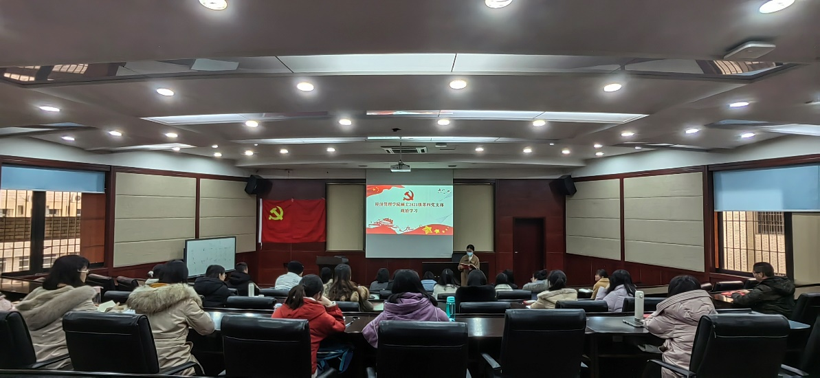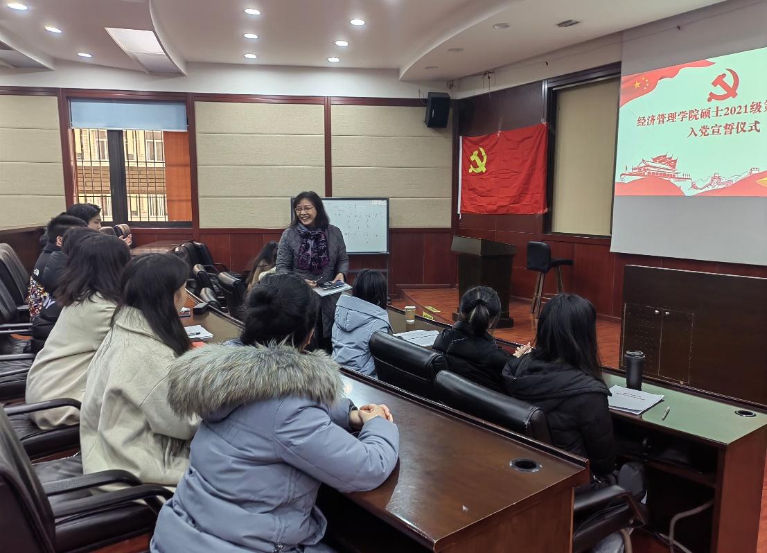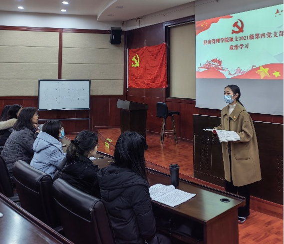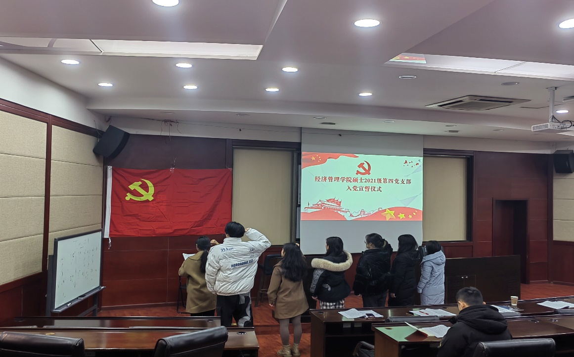 2021年12月30日下午三点在九里校区0224教室,bat365官网登录入口硕士2021级第四党支部开展了“党的十九届六中全会精神”的政治学习活动及预备党员入党宣誓仪式。活动由党支部书记吴欣悦主持,校巡视组陈燕灵老师出席指导,党支部共30人全部参加了此次活动。