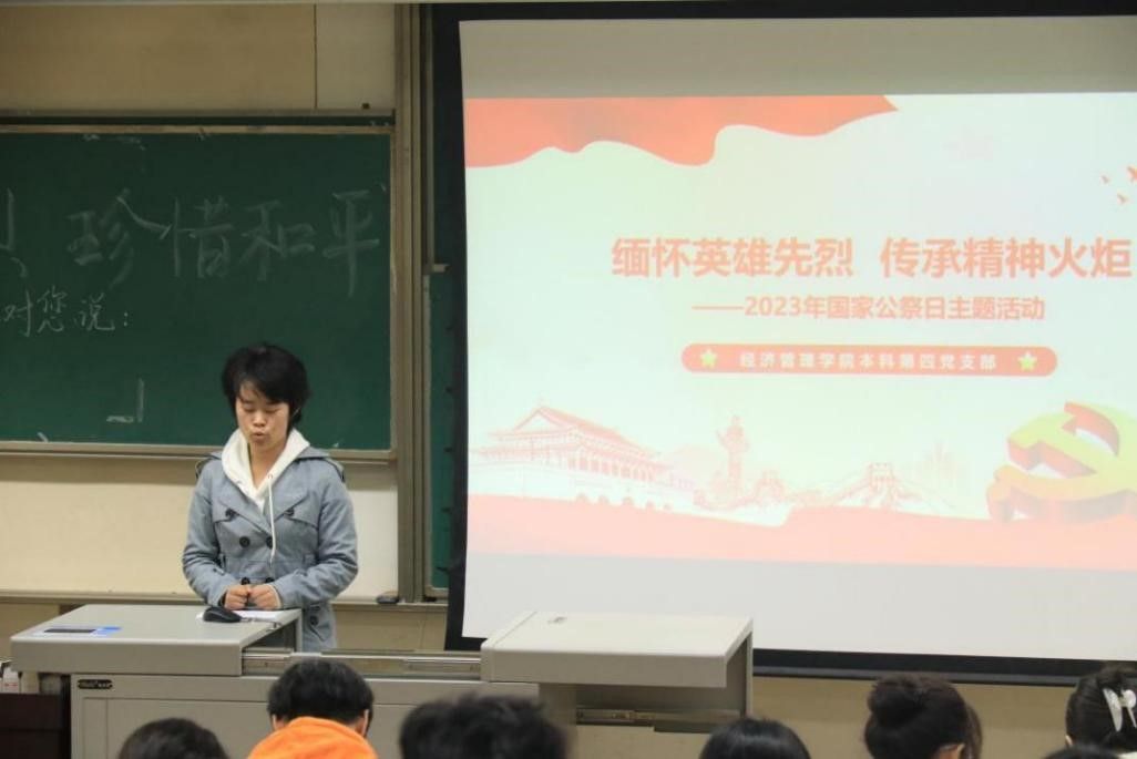 2023年12月13日是我国第十个南京大屠杀死难者国家公祭日。为缅怀先烈、传承红色基因,淬炼崇高信念、传承民族精神,进一步加深广大青年对国家公祭日的认识和理解,12月7日,bat365官网登录入口本科第四党支部在九里校区逸夫馆4218组织开展了“缅怀英雄先烈,传承精神火炬”主题党日活动,鼓励广大党员继承先烈遗志,不忘初心使命,厚植家国情怀。