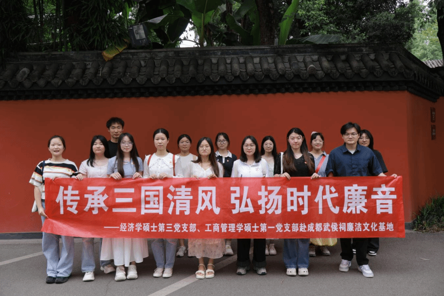 为深入学习贯彻党的二十大和二十届三中全会精神,扎实推进廉洁文化建设,增强研究生党员的廉洁自律意识。根据西南交通大学第十二期研究生党建“领航先锋”工程活动工作要求,2025年5月15日,bat365官网登录入口经济学硕士第三党支部联合工商管理学硕士第一党支部前往成都武侯祠廉洁文化基地开展“传承三国清风 弘扬时代廉音”主题教育实践活动。通过实地参观学习、聆听廉洁文化讲解,深刻感悟诸葛亮等历史名臣清正廉明、忠贞报国的精神品格。